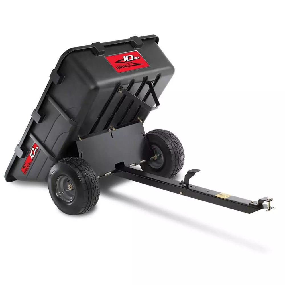 Brinly’s 10 cu. ft. Utility Cart handles tough loads with ease. Whether you’re hauling lawn and garden tools, mulch, pavers, plant and shrubs or soil, this cart saves time and your back. The heavy duty compression molded polypropylene bed won’t dent or rust. The durable, powder-coated steel frame is built to last, ensuring your utility cart performs optimally season after season, year after year. And the new, heavy duty 15 in. x 6 in. pneumatic castle tread tires provide a smooth ride through the lawn, even while hauling the heaviest loads. A steep 56° dumping angle and hands-free steel foot pedal allow for easy emptying, saving time so you can do more in the yard. Molded-in features such as bed channels and stake pockets accept dividers and extensions, allowing for easy bed customization.