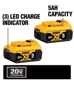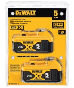 Keep your DEWALT 20-Volt MAX Tools running longer with a premium 5.0 Amp hour Lithium-Ion battery packs. These Premium XR battery packs are compatible with the entire line of 20-Volt Max tools. They provide up to 60% more capacity than a standard 20-Volt MAX battery pack (DEWALT DCB200) The Lithium-Ion batteries have no memory and virtually no self-discharge for maximum productivity and less downtime. These Premium XR battery packs are backed by a 3-year warranty and a DEWALT 90-day Money Back Guarantee for added peace of mind.