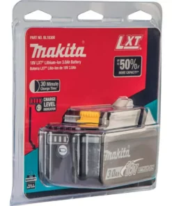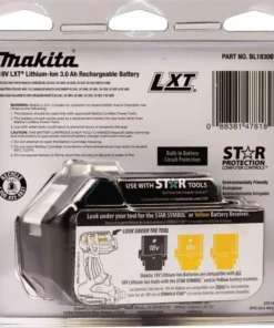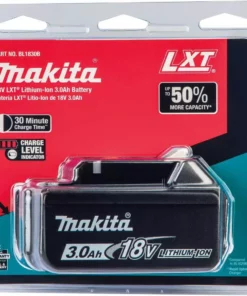 Makita 18-Volt LXT Lithium-Ion batteries charge faster and work longer than standard lithium-ion batteries, giving you and your Makita cordless tools unmatched performance and productivity for demanding applications. The Makita 3.0Ah battery (BL1830B) has a category-leading charge time of only 30-minutes, so it spends more time working and less time sitting on the charger. It also features an LED charge level indicator to monitor battery charge. Makita is the innovation leader in cordless tool technology and has the world’s cordless tool line-up powered by 18-Volt lithium-ion slide-style batteries. The BL1830B is compatible only with Star Protection tools, indicated by the Star Symbol and or Yellow Battery Receiver under the tool. Makita 18-Volt Lithium-Ion batteries resist self-discharge so they’re ready for use even after long periods of storage. The Rapid Optimum Charger (sold separately) is a smart-charging system that communicates with the battery during charging to monitor current, voltage and temperature. This helps optimize battery life and deliver a faster charge. The Charger has a built-in fan to cool the battery for faster and more efficient charging. For improved tool performance and extended battery life, Makita created STAR Protection Computer Controls. STAR Protection is communication technology that allows the tool and battery to exchange data in real time and monitor conditions during use to protect against overloading, over-discharging and overheating.