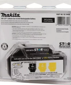 The Makita 18-Volt LXT Lithium-Ion battery charges faster and works longer than standard lithium-ion batteries, giving you and your cordless tools unmatched performance and productivity to take on the most demanding applications. The Makita 4.0Ah battery combines more run time (35% more run time per charge than the Makita BL1830 battery) with a category-leading charge time of only 40 minutes, so it spends more time working and less time sitting on the charger. For added convenience, it also features an LED charge level indicator to monitor battery charge. The 18-Volt LXT 4.0Ah battery (BL1840) is compatible only with Star Protection tools, indicated by the Star Symbol and/or Yellow Battery Receiver under the tool. Makita 18-Volt Lithium-Ion batteries resist self-discharge so they’re ready for use even after long periods of storage. The Makita Rapid Optimum Charger (sold separately) is a smart-charging system that communicates with the battery during the charging process to monitor current, voltage and temperature. This advanced charging technology helps optimize battery life and deliver a faster charge. In addition, the Charger has a built-in fan to cool the battery for faster and more efficient charging, even in hot weather conditions. For improved tool performance and extended battery life, Makita created Star Protection Computer Controls.