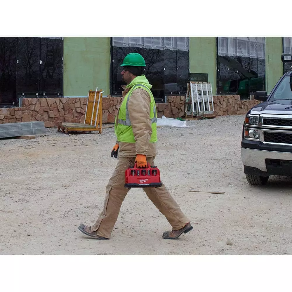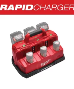 The M18 and M12 Rapid Charge Station is the fastest charging solution in the industry. With the ability to Charge 6 Pack 4X Faster, the station charges three batteries simultaneously while charging each pack up to 40% faster. The charger accepts up to (3) M18 and (3) M12 battery packs, reducing the amount of time spent changing out batteries and increasing productivity on the jobsite. Featuring REDLINK Intelligence, it communicates directly with the battery to monitor cell voltage, temperature and charge status to optimize the performance and extend the life of the pack. The station has integrated hang holes for vertical mounting, a pass through plug to conserve outlet space and a convenient carry handle to transport packs on and off the jobsite.