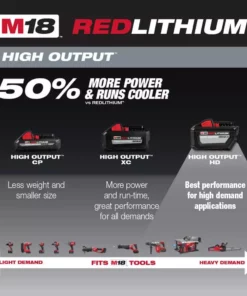 The M18 REDLITHIUM HIGH OUTPUT HD12.0 Battery Pack provides 50% more power and runs 50% cooler vs M18 REDLITHIUM HD battery packs. The massive increase in power elevates the performance of the entire M18 system and drives the next breakthrough in M18 FUEL, delivering the power of 15A corded product. It delivers fade free power and runs substantially cooler through heavy applications, allowing tradesmen to push their cordless tools harder and longer than ever before. The M18 REDLITHIUM HIGH OUTPUT HD12.0 is the best performing cold weather pack ever made, providing increased power in extreme cold weather conditions (below 0 degree F/minus 18 degree C). It provides the most work per charge of any professional power tool battery in the industry, driving full corded replacement on the jobsite. The REDLITHIUM HIGH OUTPUT HD12.0 battery is fully compatible with 175+ M18 solutions.