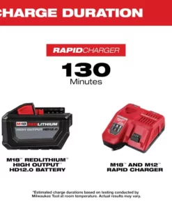 - Includes: one M18 REDLITHIUM HIGH OUTPUT HD12.0 battery pack, one M18 and M12 rapid charger