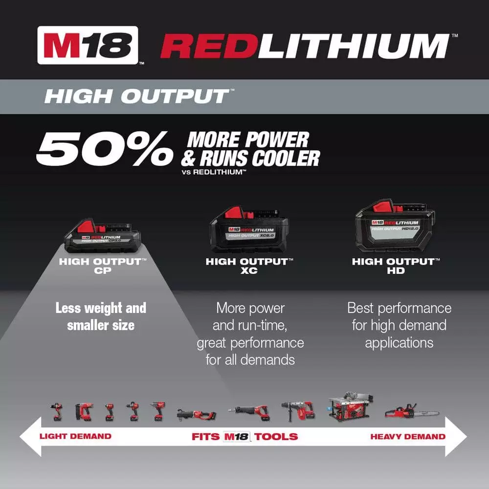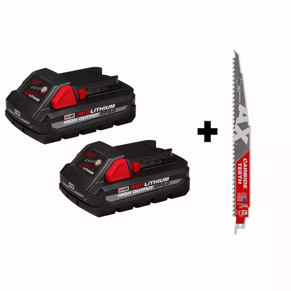 - Includes: two M18 REDLITHIUM HIGH OUTPUT CP3.0 battery packs, one 9 in. 5 TPI AX carbide teeth SAWZALL reciprocating saw blade 48-00-5226