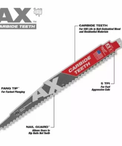 The Milwaukee M18 REDLITHIUM HIGH OUTPUT CP3.0 Battery Pack provides 50% more power and runs 50% cooler than most other batteries. The result is the same power and runtime of a M18 REDLITHIUM XC battery with a lighter, more compact package. It delivers fade-free power and runs cooler through even heavy applications, allowing you to push your cordless tools through a wide range of jobs. This battery is fully compatible with all 200 plus Milwaukee M18 solutions. The Ax with Carbide Teeth, engineered to deliver long life in the toughest applications while being the fastest carbide-tipped reciprocating saw blades on the market. These new blades will deliver 30X longer life over standard bi-metal blades and 2X faster cutting than other carbide blades.