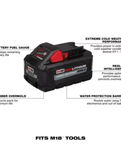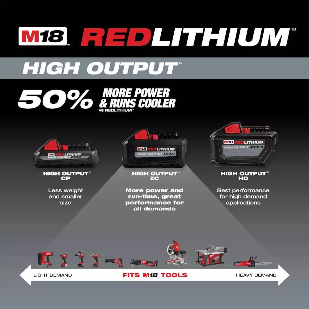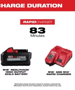 - Includes: one M18 REDLITHIUM HIGH OUTPUT XC8.0 battery pack, one M12 and M18 rapid charger