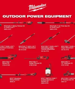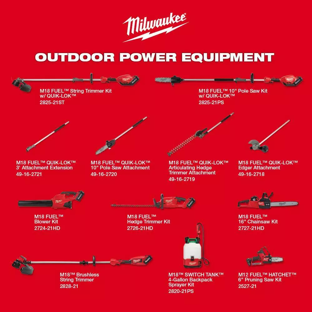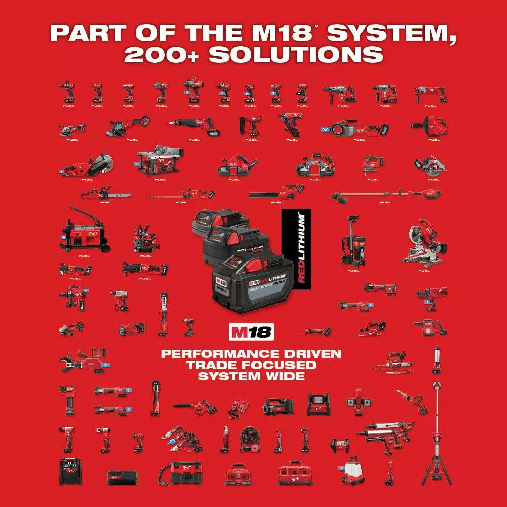 - One 2828-20 M18 brushless string trimmer, one 48-11-1865 M18 REDLITHIUM HIGH OUTPUT XC 6.0 Ah battery, one 48-11-1880 M18 REDLITHIUM HIGH OUTPUT XC 8.0 Ah battery, one 48-11-1812 M18 REDLITHIUM HIGH OUTPUT HD 12.0 Ah battery, one 48-59-1812 M18 and M12 charger, one 0886-20 M18 jobsite fan