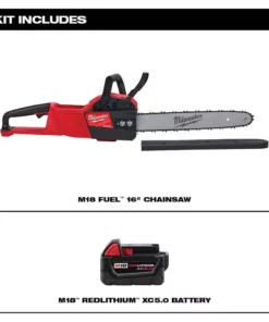 - Includes: 1 M18 FUEL 16 in. chainsaw (2727-20) one 16 in. Oregon bar and chain, 1 scrench and M18 XC 5.0 Ah battery pack (48-11-1850)