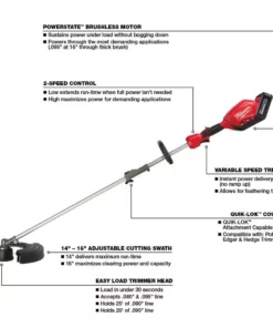 The Milwaukee M18 FUEL String Trimmer Kit with QUIK-LOK, designed for landscape maintenance professionals, provides users with the power to clear thick brush, reaches full throttle in under 1-second and features a balanced design which increases user control. The cordless string trimmer is made up of 2 components the M18 FUEL Power Head with QUIK-LOK and QUIK-LOK String Trimmer Attachment. This M18 FUEL Power Head, part of the QUIK-LOK Attachment System, is compatible with multiple attachments such as an Edger, Articulating Hedge Trimmer and Pole Saw attachment. This gives users the ability to quickly swap out attachments on a single Power Head, delivering ultimate versatility and a lower cost of ownership. The POWERSTATE Brushless Motor delivers up to 6,200 RPM with up to a 16 cutting swath and gives you the power to maintain speed in demanding applications without bogging down. The motor is positioned in the rear of the trimmer to provide the best combination of power, balance and maneuverability. REDLINK PLUS intelligence ensures maximum performance while protecting from overload, overheating and over discharge.
