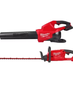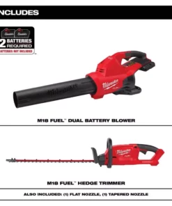 - Includes: (1) M18 FUEL Dual Battery Blower (2824-20), (1) tapered nozzle attachment, (1) flat nozzle attachment, and (1) M18 FUEL Hedge Trimmer (2726-20)
