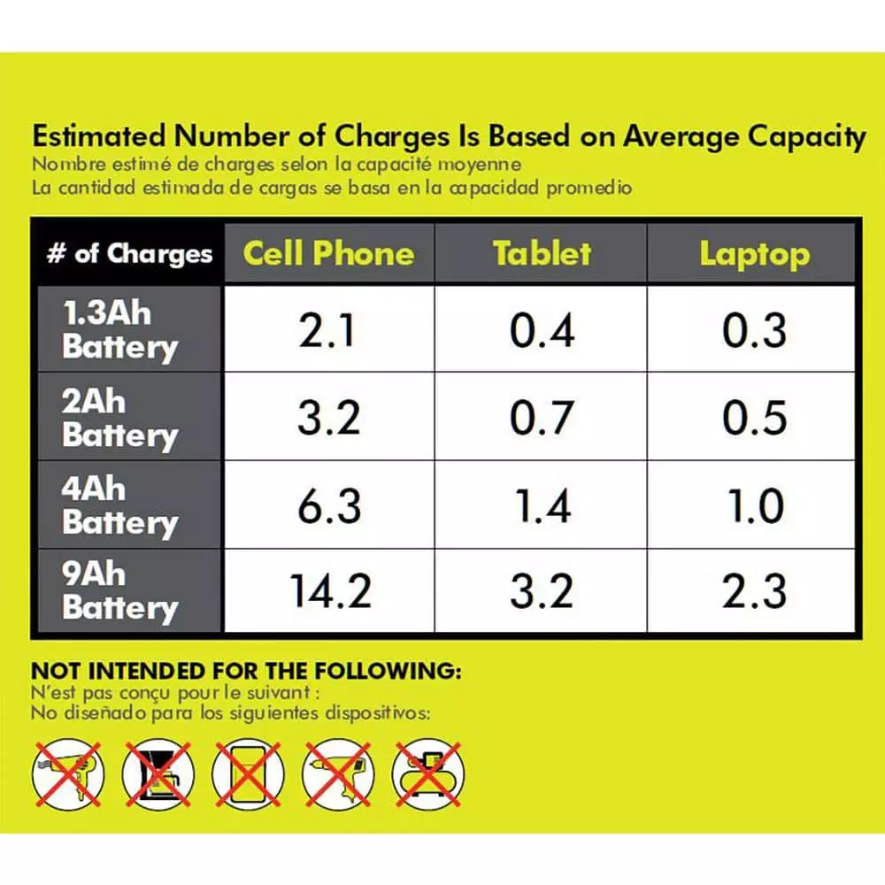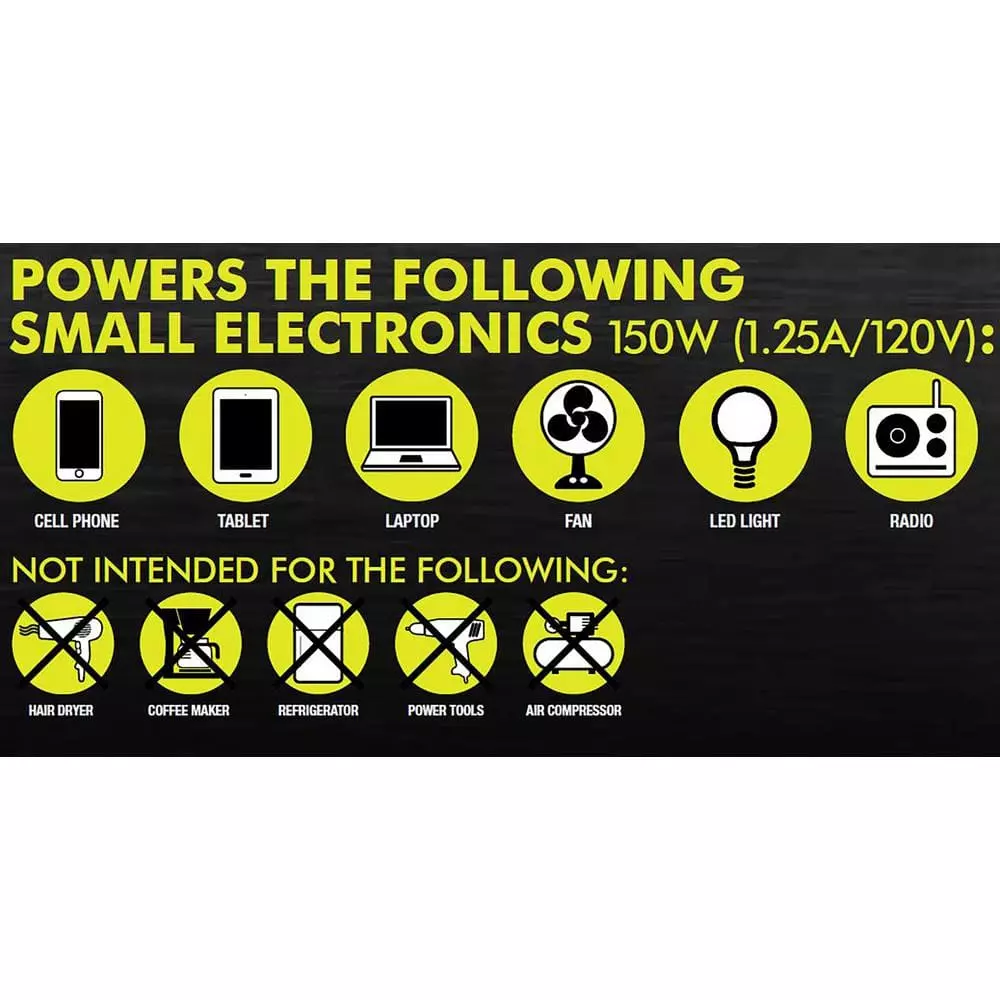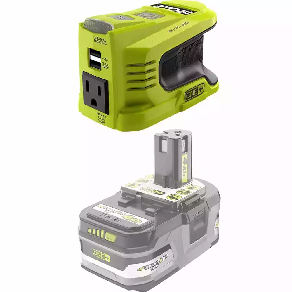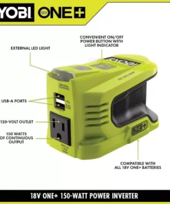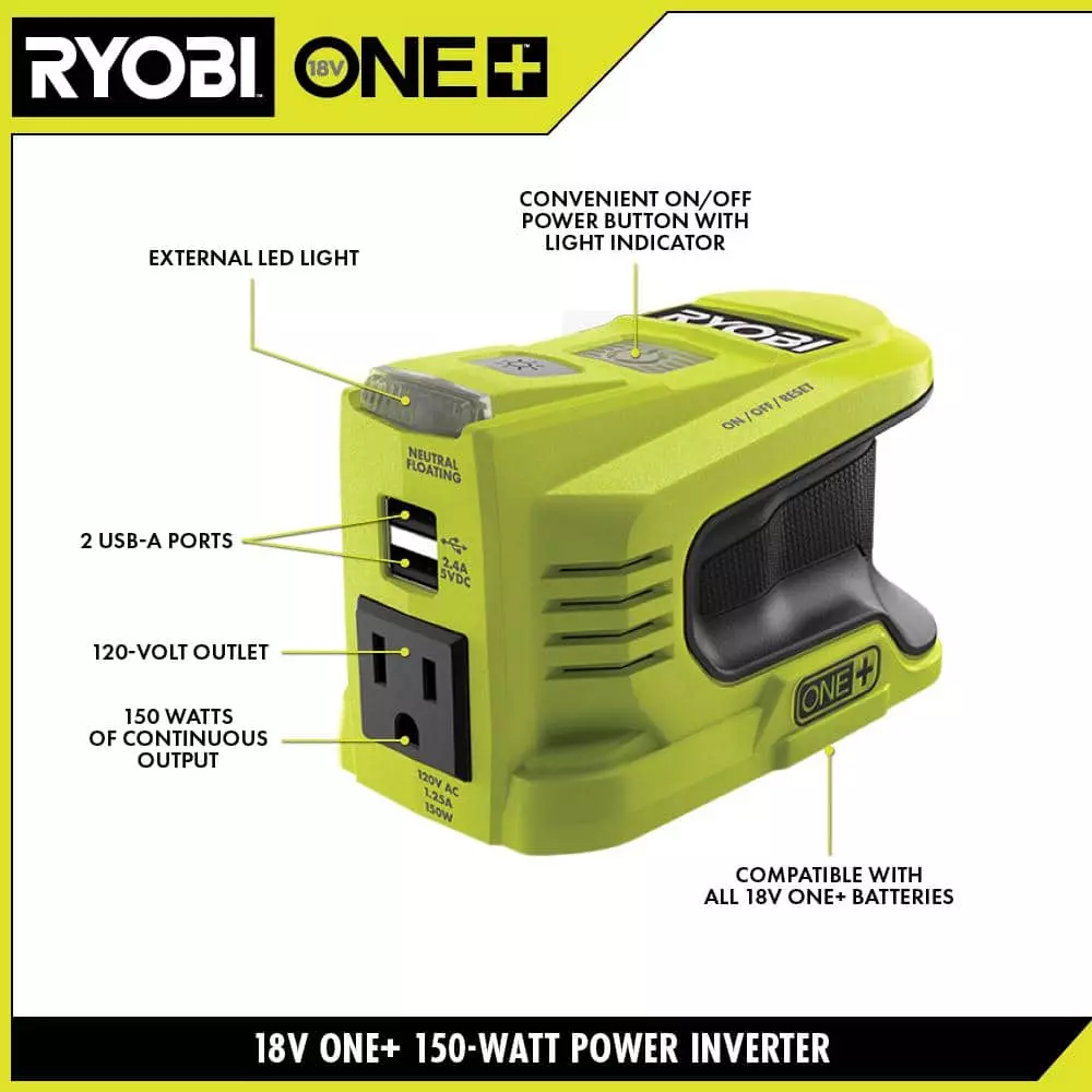 The RYOBI 18V ONE+ Power Source provides convenient, on-the-go power both on and off the jobsite. With a modified sine wave and 150-Watt of continuous output, this inverter is perfect for powering laptops, tablets, cell phones and other small electronics. This compact and lightweight design is compatible with all of your existing RYOBI One+ batteries making endless power even easier. Equipped with 2 USB outlets and one 120-Volt wall outlet for convenient and reliable power.