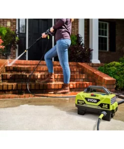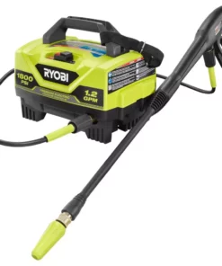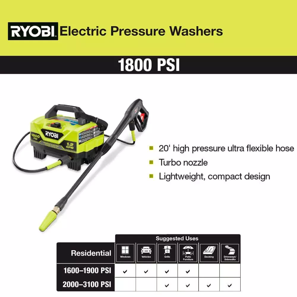 The RYOBI 1800 PSI 1.2 GPM Electric Pressure Washer is the perfect powerful yet portable option to get the job done. This pressure washer is ideal for light duty applications like cleaning small driveways, sidewalks, decks, windows, patio furniture, campers, bikes, boats, and many other recreational applications. This unit comes with a 15° nozzle and turbo nozzle, which cleans up to 50% faster than a standard nozzle. Not only is the pressure washer lightweight and portable, but the included 20 ft. ultra flex hose is 50% lighter, reducing fatigue and allowing for easy maneuverability. Attach the soap applicator for a deeper clean when detergent is needed on tough messes. The spray wand and nozzles use 1/4″ quick-connect. The compact design allows for convenient storage in smaller spaces. The RYOBI 1800 PSI 1.2 GPM Electric Pressure Washer is backed by a 3-year limited warranty.