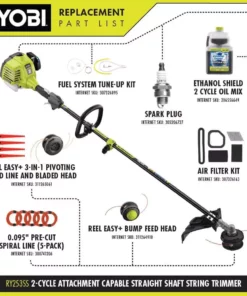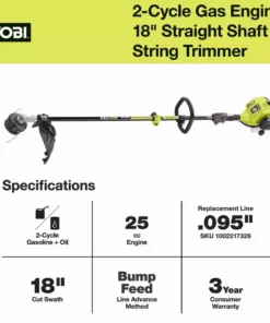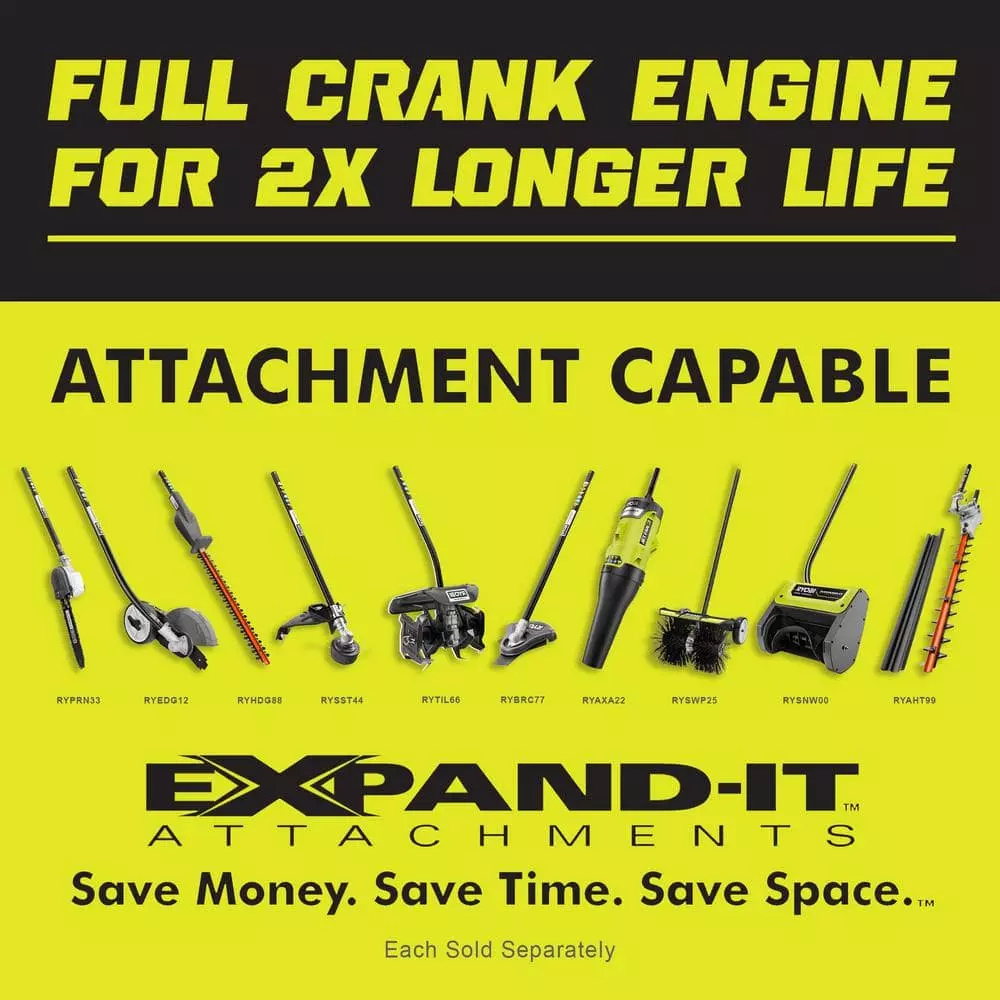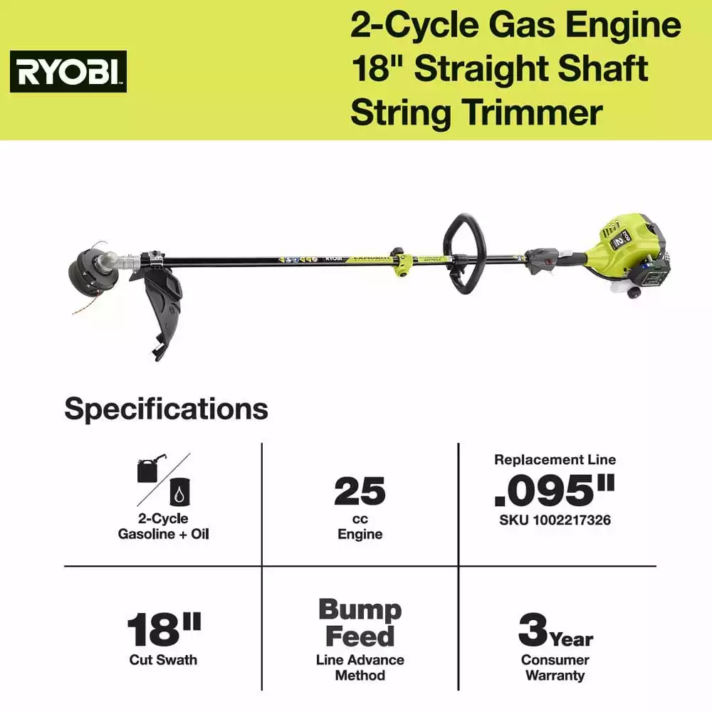 This RYOBI 2-cycle gas straight shaft string trimmer features a full crank engine that creates 2x longer life. Accepting RYOBI expand-it universal brand fit attachments, this string trimmer offers versatile operating function, allowing you to save time, space and money. Simply attach an edger, blower or even a tiller to the power head and quickly move from project to project. RYOBI makes string head reloads easier with the reel-easy string head, thread your string, twist the head and resume trimming. You will experience easier starting with the Zip Start carburetor and included ethanol shield 2-Cycle Oil. Backed by a 3-year warranty, trust the RYOBI 2-Cycle Gas Straight Shaft String Trimmer for your outdoor trimming needs.