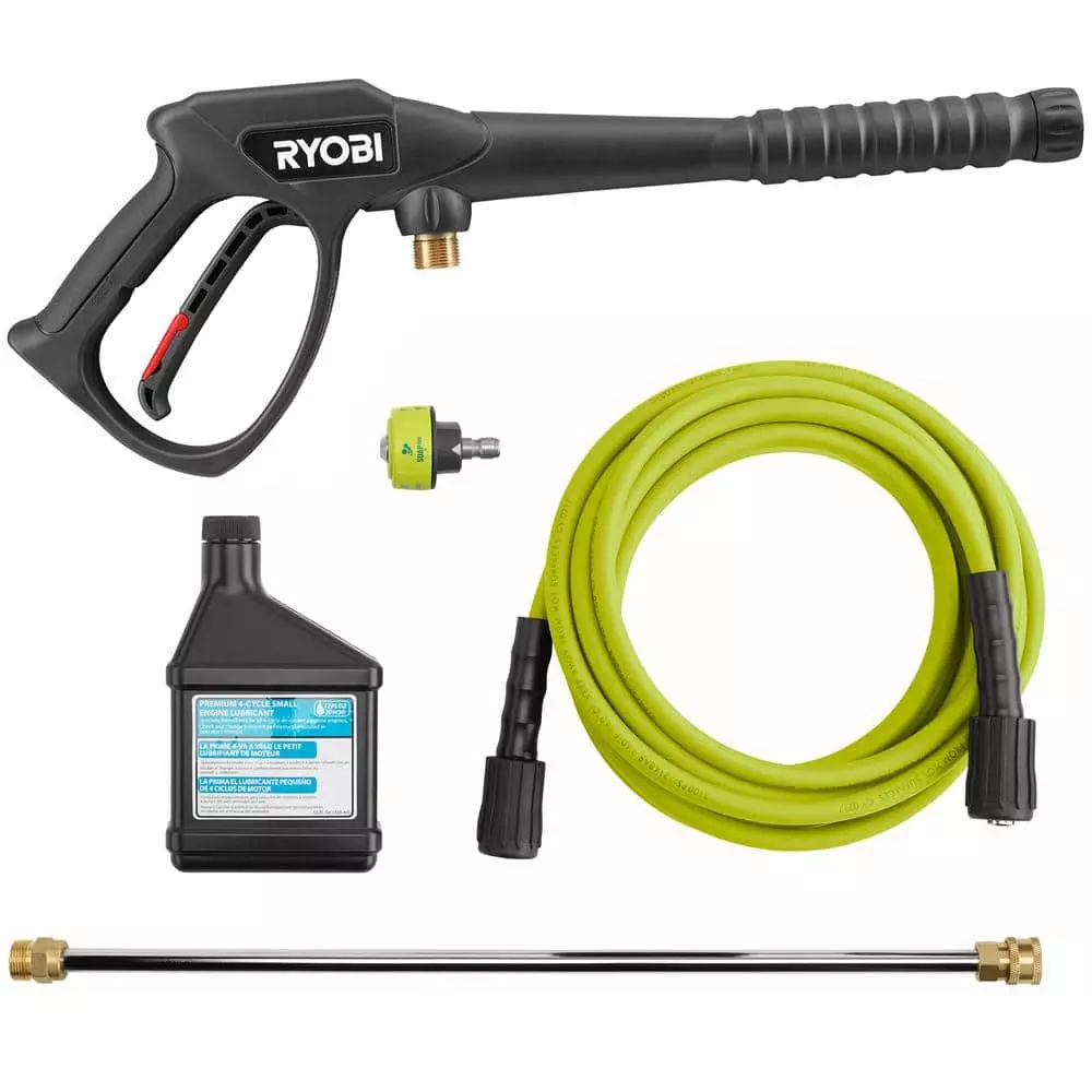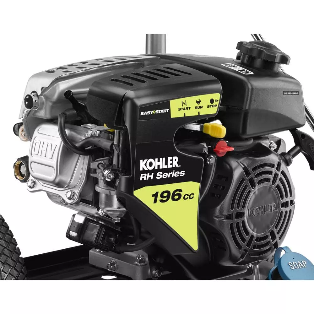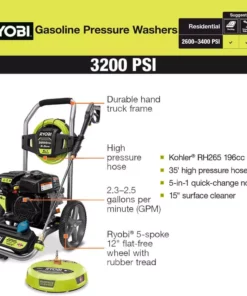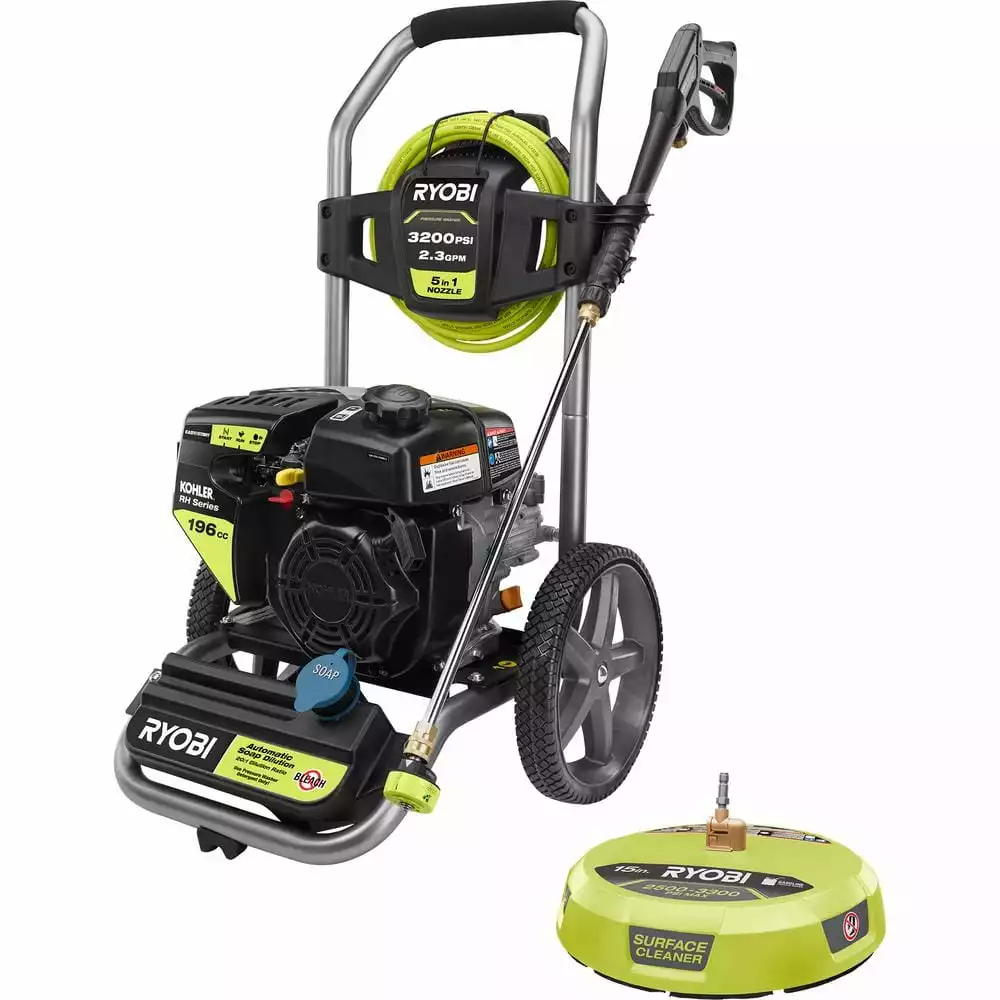 Get cleaning jobs done faster with this Ryobi 3200 psi pressure washer. Perfect for driveways, patios, and sidewalks, it features a 15-in. surface cleaner. The Kohler 196cc Engine provides 3200 PSI of force for superior clearing power. For convenient access, it features a 35-ft. non-marring high pressure hose for 40% longer reach and an on-board detergent tank. A 5-in-1 quick-change nozzle makes it simple to change spray patterns. Moving this pressure washer is easy with a sturdy hand truck frame and 12-in. wheels.