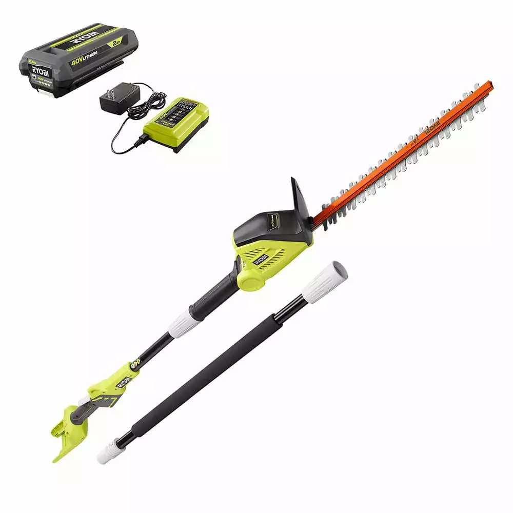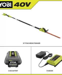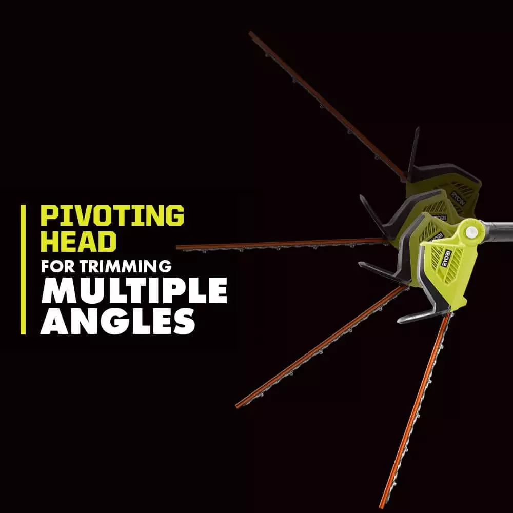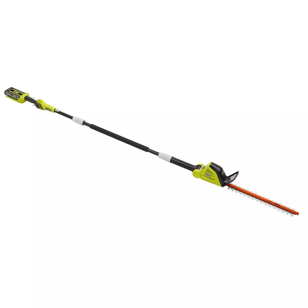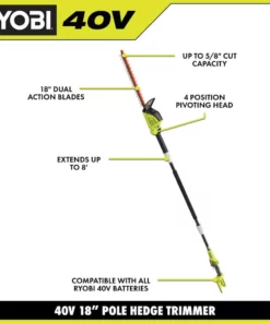 The RYOBI 40V Pole Hedge Trimmer is ideal for any hedge maintenance around the house. The pivoting head allows for trimming at multiple angles and optimized cutting performance. Designed to reach greater heights you can extend the pole up to 8 ft. The 40V Pole Hedge Trimmer is equipped with 18 in. dual-action blades and a 5/8 in. cut capacity. Back by a 5-year warranty.