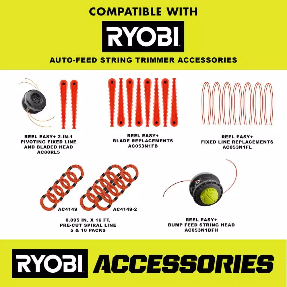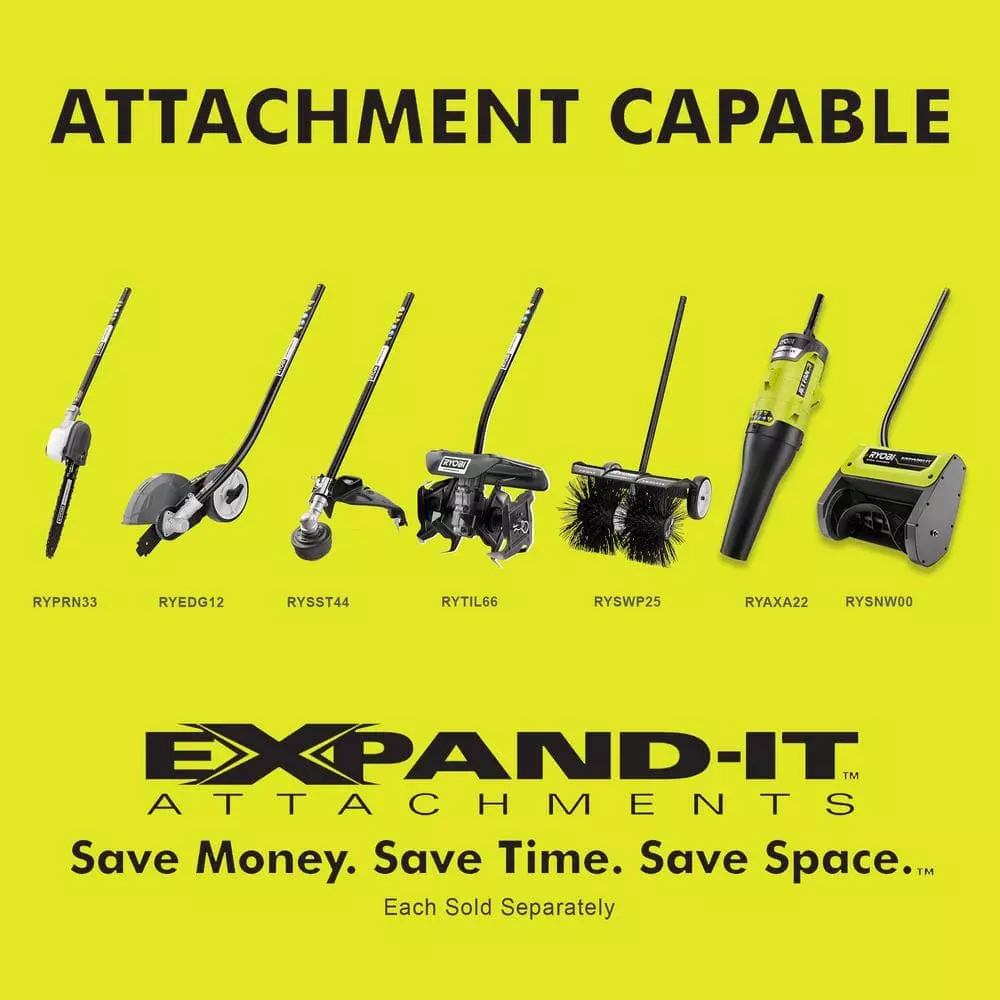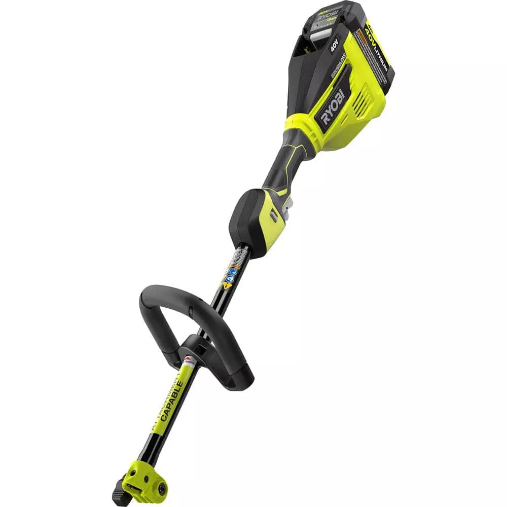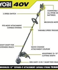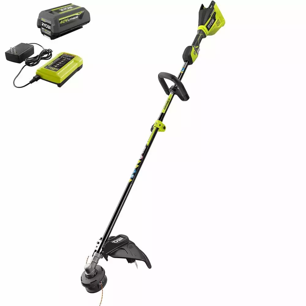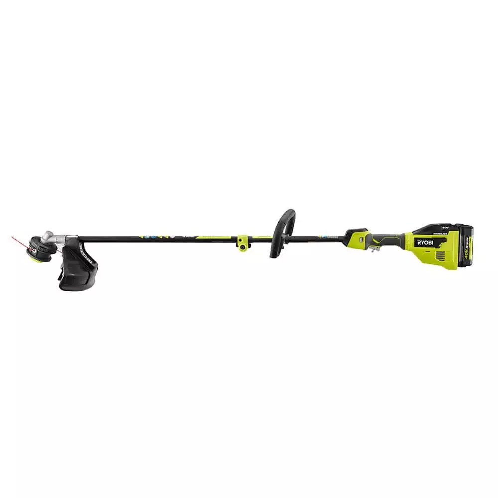 The RYOBI 40V Brushless String Trimmer gives you the cordless convenience you want with the GAS-LIKE POWER you need. The EXPAND-IT attachment capability allows you to transform your trimmer into an edger, blower, pole saw and many more tools with the available attachments, meaning you can save time, space and money. This RYOBI trimmer has a brushless motor for maximum power and durability. This unit is equipped with the REEL EASY plus 3-in-1 Bump Feed Head with SPEED WINDER, which can be reloaded in 60-seconds or less. This REEL EASY plus head can function as a bump feed head, fixed line head or bladed head. The variable speed trigger and 2-speed switch deliver increased control for any application. The adjustable 13 in. to 15 in. cut swath allows you to optimize your trimmer for increased run time or increased productivity. This lightweight and well-balanced design also has an adjustable front handle for user comfort and is backed by a 5-year warranty. The trimmer is equipped with a 4.0 Ah battery and charger that are compatible with over 75 RYOBI tools on the RYOBI 40V system.
