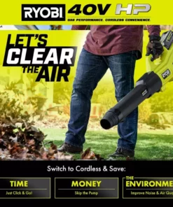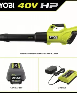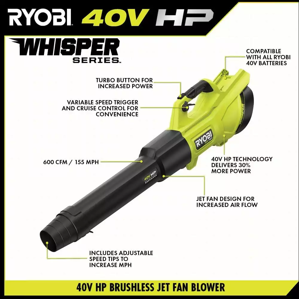This 40-Volt HP WHISPER SERIES Blower delivers incredible power without the noise! Delivering 600 CFM and 155 MPH this blower can tackle wet and dry leaves. It is a part of our WHISPER SERIES of products and is 85% quieter than a gas blower! Giving you all the power without the noise. This blower is loaded with premium features like a variable speed trigger to blow in more delicate areas, cruise control to reduce fatigue during extended use, a turbo button for maximum power, and a speed tip attachment to increase your air speed for heavier debris. All of these features combine to provide you with ultimate control to meet your needs. This kit is equipped with a 40-Volt 4.0 Ah battery and charger. The battery is compatible with the RYOBI 40-Volt system. The 40-Volt HP WHISPER SERIES Jet Fan Blower is backed by a 5-year tool warranty.