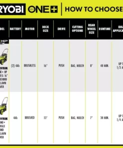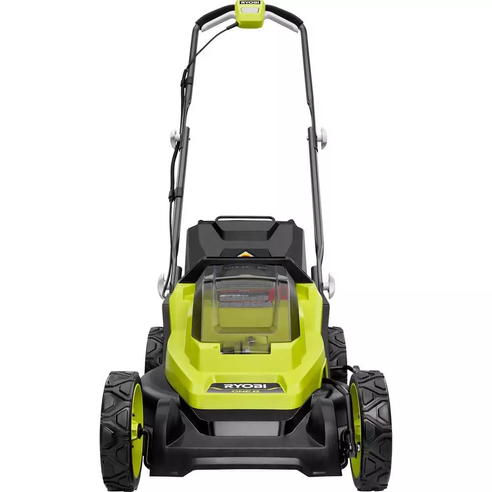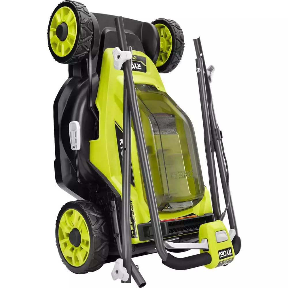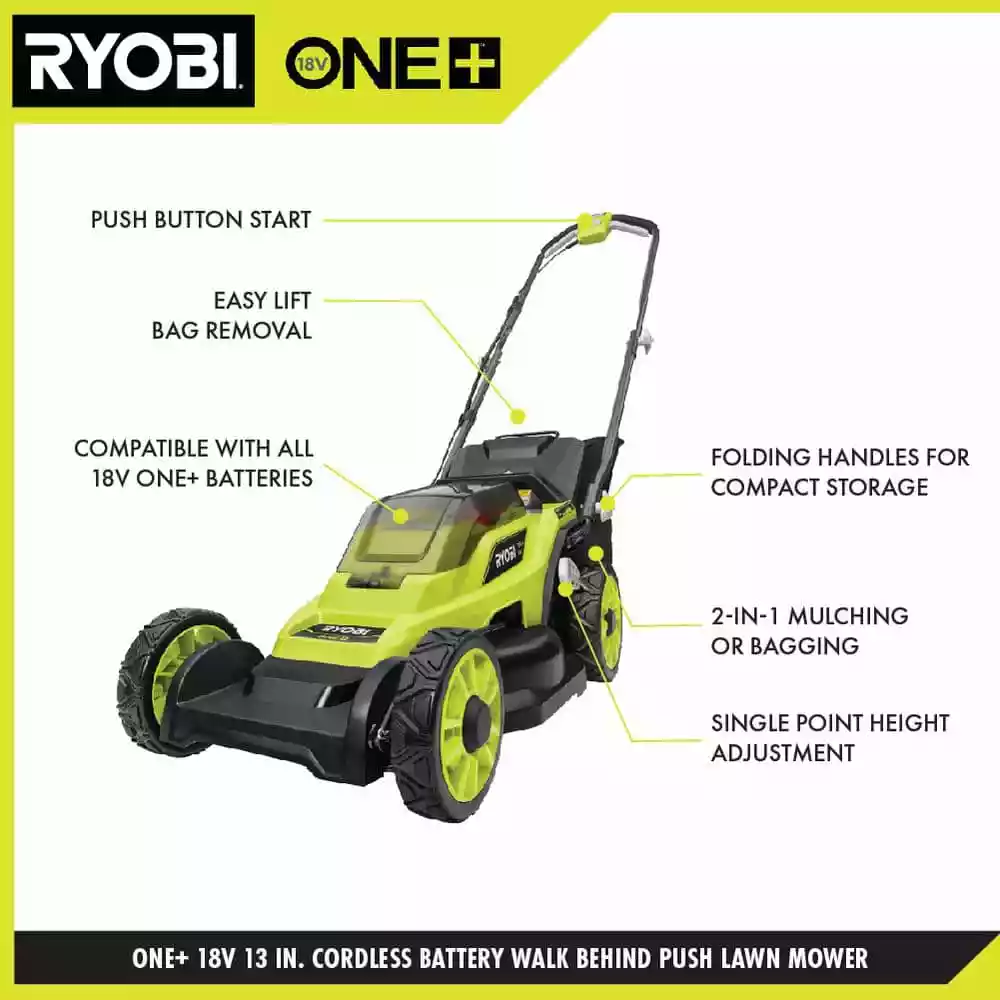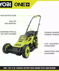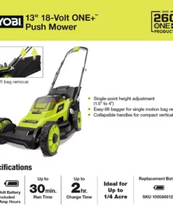 The RYOBI 18V ONE+ Cordless 13″ Mower easily starts with the push of a button and mows up to a ¼ acre or up to 30 minutes on a single charge. Simply insert the included battery and you’re ready to mow in seconds without the hassle of gas or oil. This mower features a single point height adjustment, 2-in-1 mulching and bagging functions, and easy lift bag removal. The compact, lightweight design makes it easy to carry from one place to another, and the handles fold for convenient, vertical storage when the job is done. The RYOBI 18V Cordless 13″ Mower includes an 18V ONE+ 4.0 Ah battery and charger and is backed by a 3-year warranty.