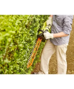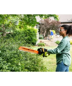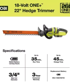 The RYOBI 22 in. 18V ONE+ Cordless Hedge Trimmer is ideal for any hedge maintenance around the house. The ONE+ Hedge Trimmer redefines the 18V category by delivering the power and performance you’d expect from higher voltage lines, while its lightweight, compact design makes it comfortable and easy for anyone to operate. With the upgraded 22 in. dual-action blades and a 3/4 in. cut capacity, this hedge trimmer can handle even the toughest hedges. Featuring a wrap-around front handle and rotating rear handle, this unit provides precision cutting at any angle. This trimmer also features a Hedge Sweep that clears clippings and debris while you trim. Back by a 3-year warranty.