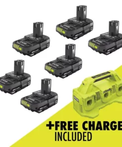 RYOBI introduces the 18V ONE+ Lithium-Ion 2.0 Ah Compact Battery (6-Pack) with 6-Port Charger. These RYOBI ONE+ 18V Lithium-Ion 2.0 Ah batteries provide up to 1.5X more runtime compared to our 1.5 Ah standard Lithium-ion battery. They are compatible with over 260 18V ONE+ tools to power you through all types of projects. They have a compact design for less weight and reduced user fatigue. They also feature professional grade Lithium-ion cells to provide fade free, cord-like power. They perform in extreme weather temperatures and are engineered to be impact resistant. These batteries feature integrated LED fuel gauges to check your battery charge at all times. The 6-Port Charger is compatible with all RYOBI 18V Lithium-Ion Batteries. Best of all, they are a part of the RYOBI ONE+ System of over 260 cordless tools that all work on the same battery platform. Backed by the RYOBI 3-Year Manufacturer’s Warranty, these batteries include a 6-Port Charger and operator’s manual.