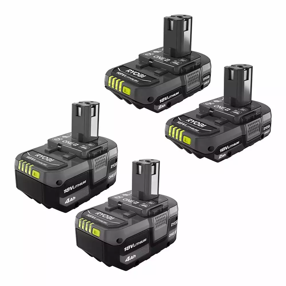 RYOBI introduces the 18V ONE+ Lithium-Ion Battery Kit with (2) 4.0 Ah Batteries and (2) 2.0 Ah Batteries. The RYOBI 18V ONE+ Lithium-ion 4.0 Ah batteries provide up to 3X more runtime. They are compatible with over 225 18V ONE+ tools to power you through all types of projects. They feature professional grade lithium-ion cells to provide fade free, cord-like power. They perform in extreme weather temperatures and is engineered to be impact resistant. These batteries also feature an integrated LED fuel gauge to check your battery charge at all times. The RYOBI ONE+ 18V Lithium-ion 2.0 Ah batteries provides up to 1.5X more runtime compared to our 1.5 Ah standard lithium-ion battery. They have a compact design for less weight and reduced user fatigue. They also feature professional grade lithium-ion cells to provide fade free, cord-like power, and perform in extreme weather temperatures and is engineered to be impact resistant. These batteries features an integrated LED fuel gauge to check your battery charge at all times. Best of all, they’re all a part of the RYOBI ONE+ System of over 225 Cordless Tools that all work on the same battery platform. Backed by the RYOBI 3-Year Manufacturer’s Warranty, these batteries include an operator’s manual. Charger sold separately.