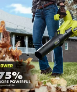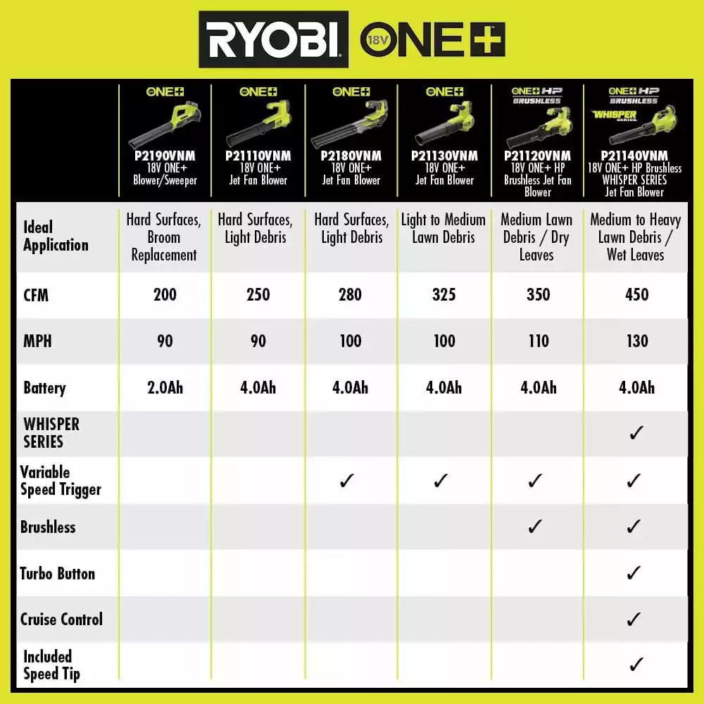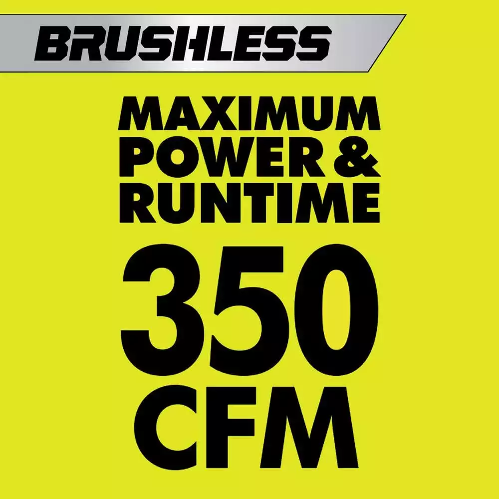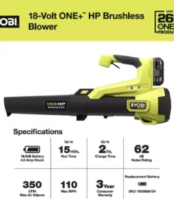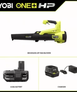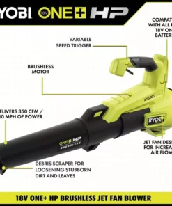 The RYOBI 18V ONE+ HP Jet Fan Blower is the perfect tool for fall cleanup. Simply insert the 18V battery and pull the trigger to start. The premium HP brushless motor provides more power, longer runtime, and a longer motor life. This blower is ideal for light to medium duty use like blowing leaves and light debris. The lightweight design is perfect for users who need a powerful, lightweight option. This handheld blower features a variable speed trigger for more control while cleaning around the home. The jet fan design increases airflow by delivering 350 CFM and 110 MPH of clearing power, allowing for a quick and easy clean up. This blower is also equipped with a 4.0 Ah battery and charger that are compatible with over 260 RYOBI 18V products. This tool is back by a 3-Year Limited Warranty.