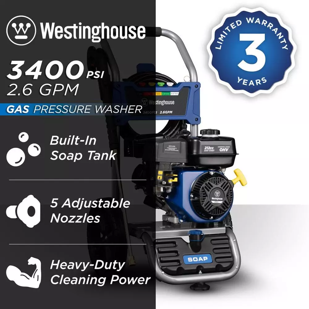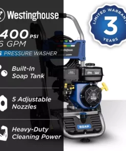 The Westinghouse WPX3400 Gas Powered Pressure Washer, with 3400 PSI and 2.6 GPM, is designed to tackle your toughest cleaning jobs with ease. Built with a powerful 4-cycle OHV Westinghouse Engine and a maintenance free axial cam pump, it’s meant for powerful heavy-duty cleaning. With 5 interchangeable nozzle tips and a built-in 1.6 L soap tank, the WPX3400 has the versatility to handle a variety of situations and surfaces including brick, stone, concrete, wood, aluminum and iron. The 3.3 L fuel tank and never-flat wheels offer easy mobility and maneuverability, allowing you to get into those hard-to-reach places with the toughest grime. Make all your deep-cleaning projects easier than ever before with the Westinghouse WPX3400 Pressure Washer.